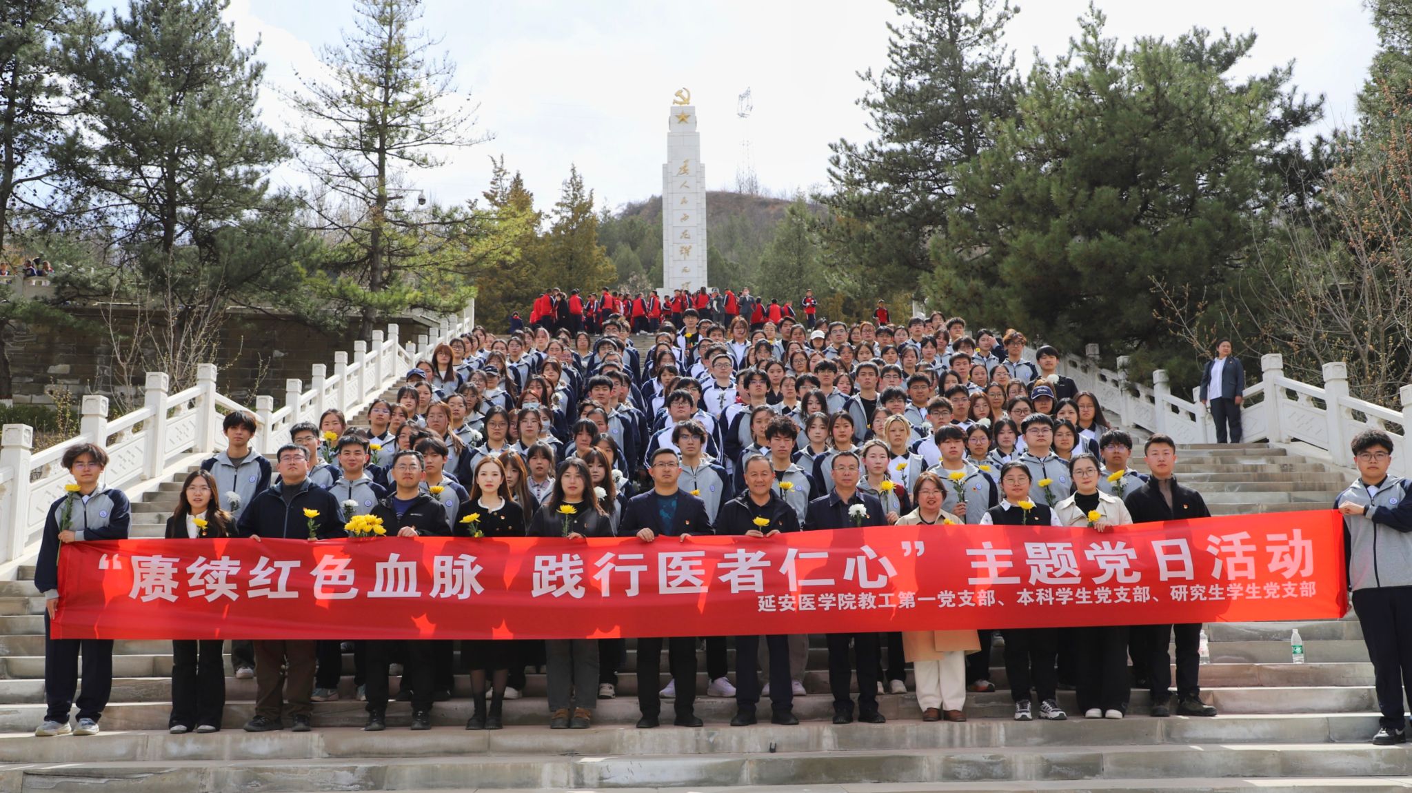 为缅怀革命先烈、传承红色基因、厚植家国情怀,2026年4月1日下午,必发集团组织师生代表、入党积极分子共200余人,赴延安“四・八”烈士陵园开展“赓续红色血脉 践行医者仁心”清明节祭扫活动。