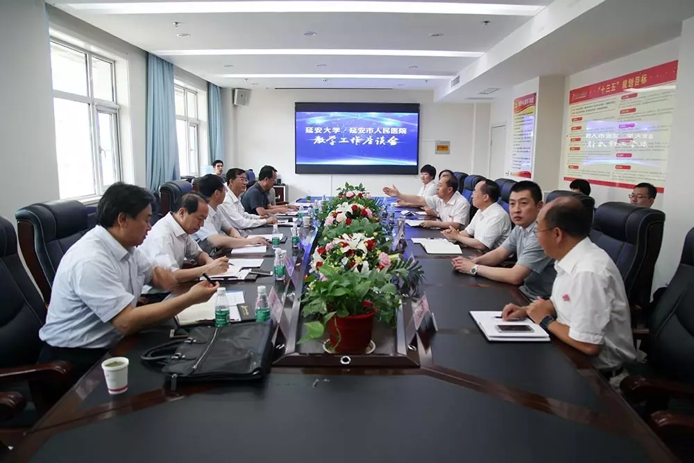 6月29日,我校校长张金锁率副校长武忠远、教务处处长付峰、研究生处处长王文强,欢迎光临必发集团医学院院长韩继明、副院长王璐到我校第四附属医院(延安市人民医院)视察教学工作。市政协副主席、延安市人民医院院长蔺广东,市科协副主席、延安市人民医院副院长吴栋等陪同。