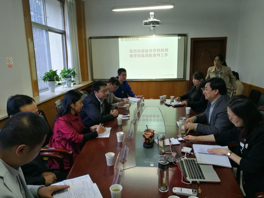 5月9日下午,延安市科技局副局长李建雄、成果市场科科长刘建琴、发展计划科科长柳江川、副科长拓宁及陕西逯博士健康管理有限公司延安分公司代表一行来我院进行调研,李建雄副局长与院长韩继明、副院长杨彦玲及教师代表进行了座谈交流,座谈会由韩继明院长主持。
