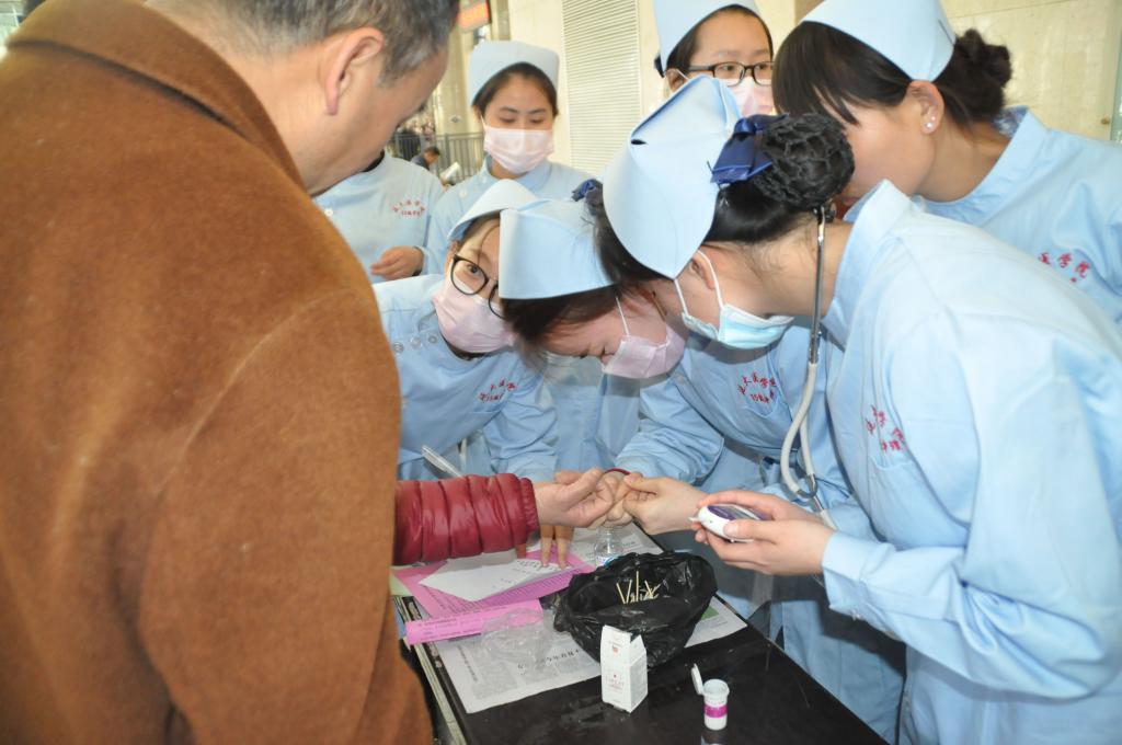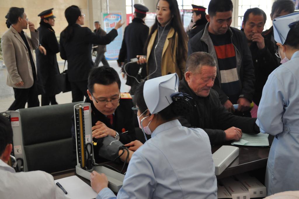 活动中,学生们走进火车站,开展健康常识的宣教,提供义务的医疗诊断与咨询。量血压、测血糖、称体重等健康评估的过程和细节处处体现了新一代医疗人才的专业化和规范化。
