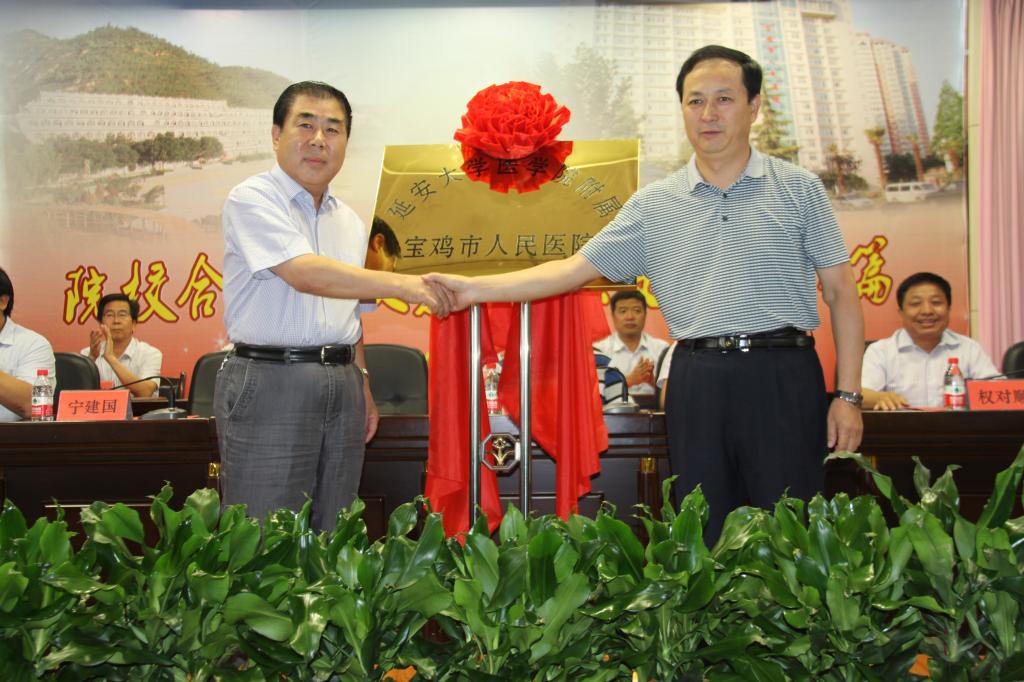 最后,韩继明院长和权对顺院长共同签署了欢迎光临必发集团与宝鸡市人民医院共建附属医院协议书;胡俊生副校长和宁建国局长共同为欢迎光临必发集团附属宝鸡市人民医院揭牌。