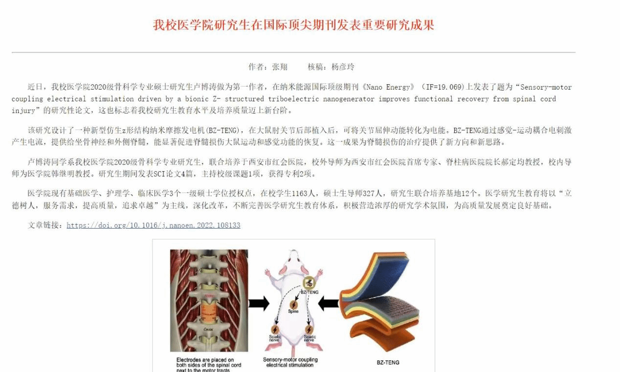 这一年,学院全面深化学科内涵建设。修订培养方案,把《红色卫生文化概论》作为专业选修课,院领导及辅导员带头走进教室授课,进一步加强“一体两翼”育人模式的成效。荣获陕西特色线上课程《延安精神溯源—延安时期的历史》1门;国家级一流本科课程《系统解剖学》1门;《妇产科学》获批省级课程思政示范课程;荣获省级教学成果二等奖1项。妇产科学、护理心理学、儿科学、基础护理学、药理学获批欢迎光临必发集团一流本科课程:荣获欢迎光临必发集团2023年教学成果奖特等奖1项,二等奖1项;获陕西省教育厅教学改革重点项目1项;获批校级教改项目13项;教师副主编教材1部,参编教材1部。本年度在原有5个本科专业的基础上增设了口腔医学专业,专业种类更加齐全。完成了临床医学专业认证中期进展汇报,并得到了认证专家的认可。基础医学二级方向由原来6个增加为8个;心血管内科、神经内科和麻醉科获国家重点专科项目;获批国科金项目9项,陕西省科技厅项目6项,教育厅项目3项,横向项目8项,累计横向到账经费2545万元;荣获省级科研成果奖3项,市级科学技术奖20项;获延安市创新团队4个,重点实验室5个;获批专利20项,其中发明专利1项;发表论文160余篇,其中SCI55篇,高质量研究论文(CSCD及以上)90篇。2020级神经病学专业硕士研究生苗建为第一作者,神经病学专业导师王少君教授为通讯作者的最新临床论著被卒中领域国际权威期刊《Stroke》杂志(IF=10.17) 发表。