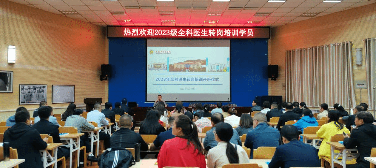 为进一步加强基层医疗队伍建设,提升基层医疗卫生服务能力和基层卫生工作人员的技术水平,促进基层医疗卫生全面发展。按照陕西省卫健委《关于做好2023年全科医生转岗培训项目报到工作的通知》的文件要求和安排,我院于9月19日在路遥学术报告厅举办2023年全科医生转岗培训开班仪式,医学继续教育中心主任杨加周、班主任李荣华及来自延安、榆林19个县区105名全科医生转岗培训学员参加了仪式。开班仪式由医学教育教育中心主任杨加周主持。