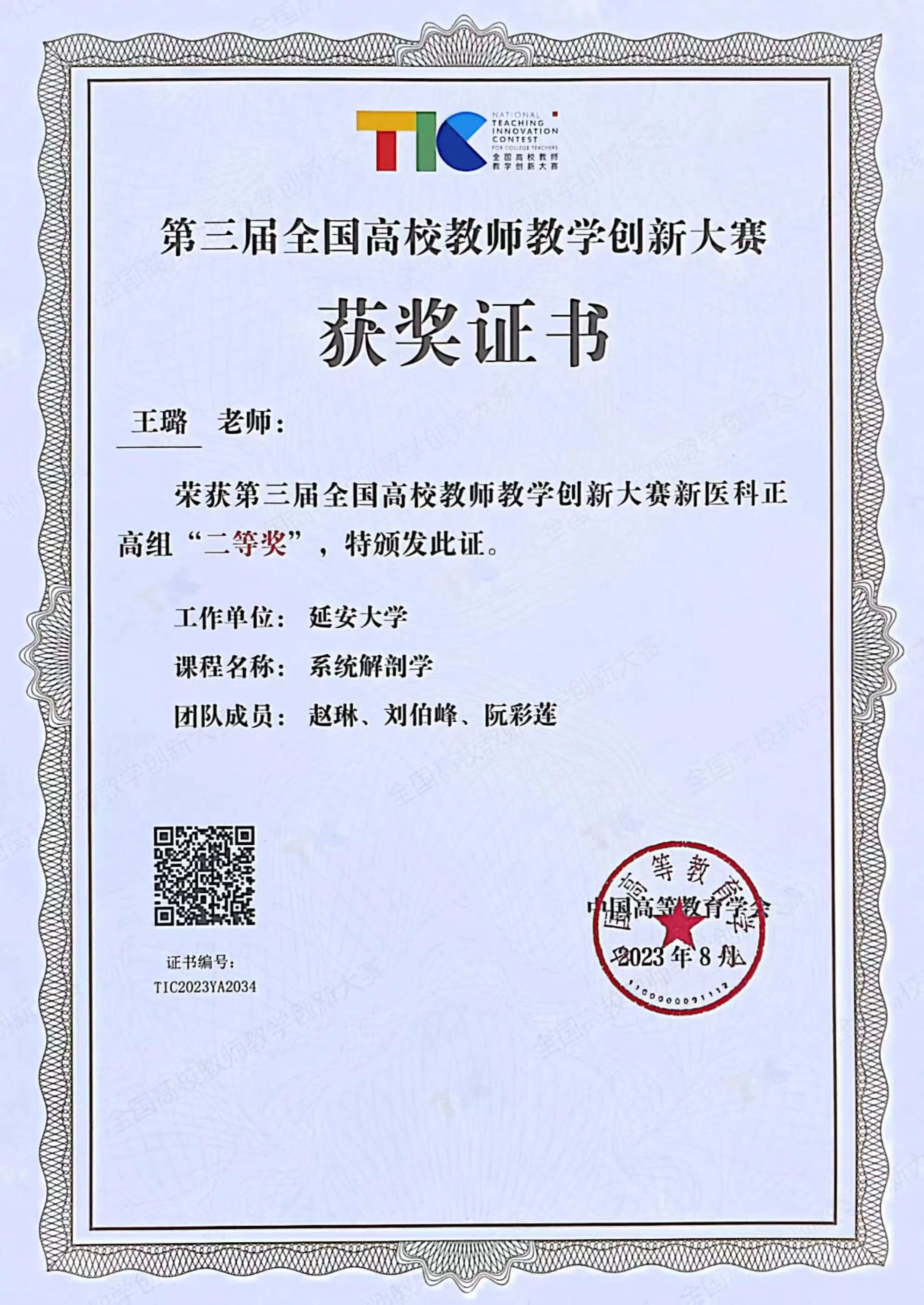 第三届全国高校教师教学创新大赛于2022年10月26日正式启动。经过我院、学校推荐,提交教学设计、教学创新报告、课程视频、创新成果等材料,省赛选拔等环节,王璐教授及其团队成员(赵琳、刘伯锋、阮彩莲)申报的《系统解剖学》课程被选拔为陕西省国赛参赛课程。学校领导高度重视国赛准备工作,我院积极配合支持,评估处制订了参加国赛打磨备赛工作方案,从经费保障、专家指导、技术支持、打磨提升等方面提供全方位服务和保障。与省内其他国赛选手一起,邀请省内外评委专家,围绕课程内容、教学设计、创新报告、课程汇报、材料准备等方面,全方位集中打磨提升8次,对照比赛评分标准,不断修改完善参赛材料,提升讲授汇报能力。