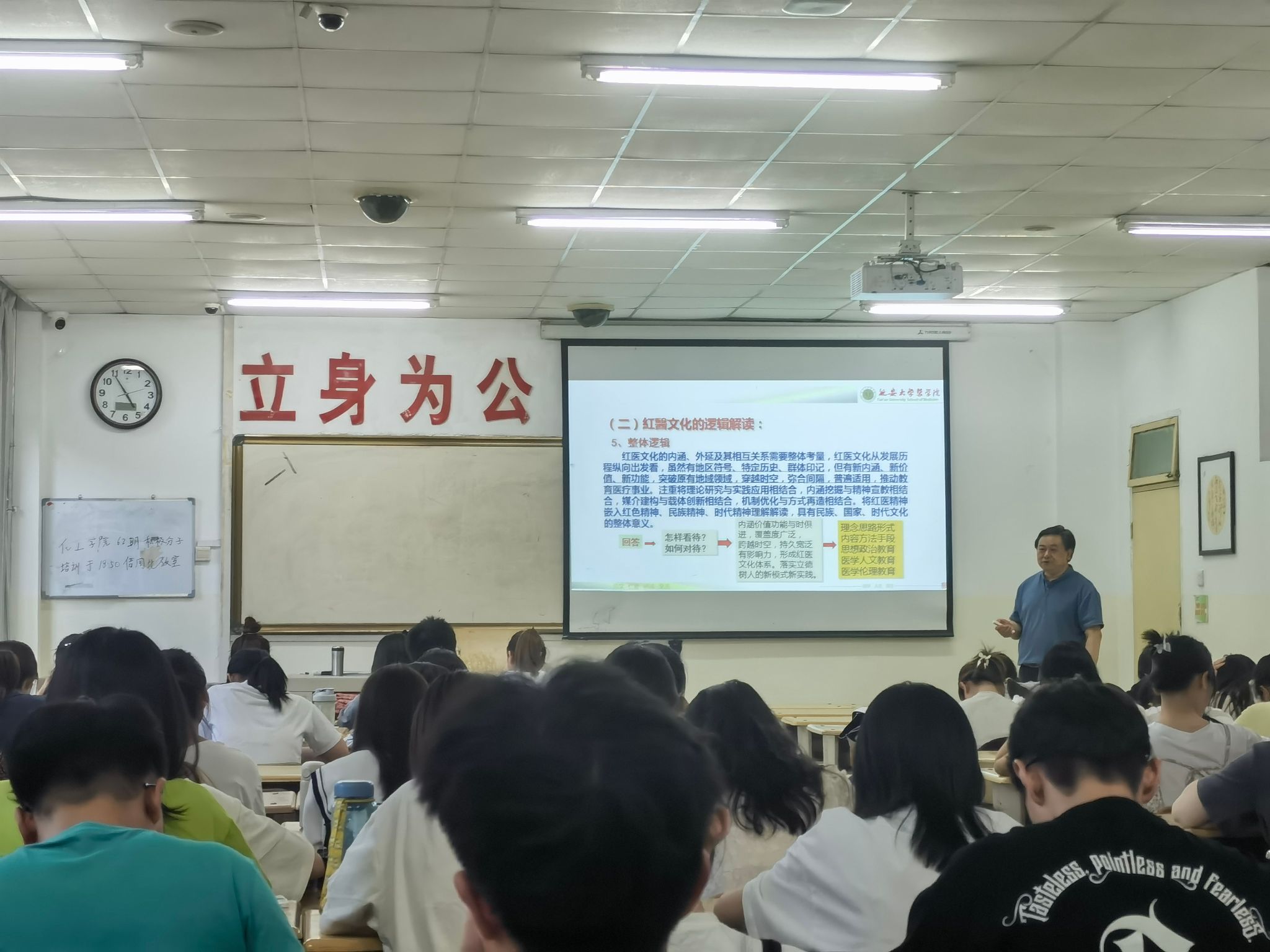 韩继明以“学习贯彻习近平新时代中国特色社会主义思想,用红医精神强师铸魂,培养学生医者仁心”为题,指出红医精神是中国共产党红色基因的重要组成部分,至今闪耀着伟大建党精神的光辉。随着中国特色社会主义进入新时代,红医精神的科学内涵不断丰富,具体可以概括为:一是对中国共产党的绝对忠诚;二是对患者极端负责,对技术精益求精;三是全心全意为患者健康服务;四是勇于创新,敢为人先。同时,他也从国家、社会、个人层面总结了对红医文化、红医精神的学习实践,并提到:正是在红医精神的感召下,在“博学仁爱、精诚至善”院训的浸润中,一代又一代的学子肩负起“健康所系,性命相托”的重任,奔赴祖国最需要的地方,为祖国医药卫生事业的发展和人类身心健康培养新时代医学好青年作贡献。