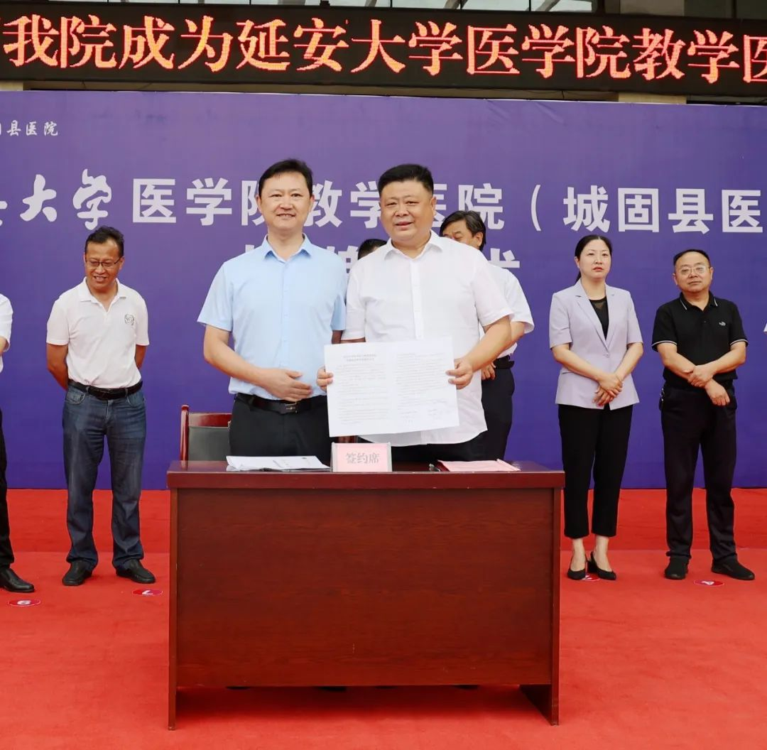 教务处副处长兼医学院教学办主任高枫与城固县医院党委副书记、院长朱宏升代表院校双方签订教学医院协议。