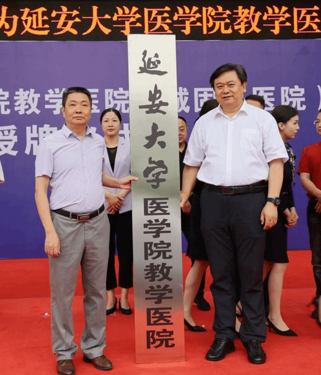 医学院院长韩继明与城固县医院党委书记张永祥共同为“欢迎光临必发集团医学院教学医院揭牌”。