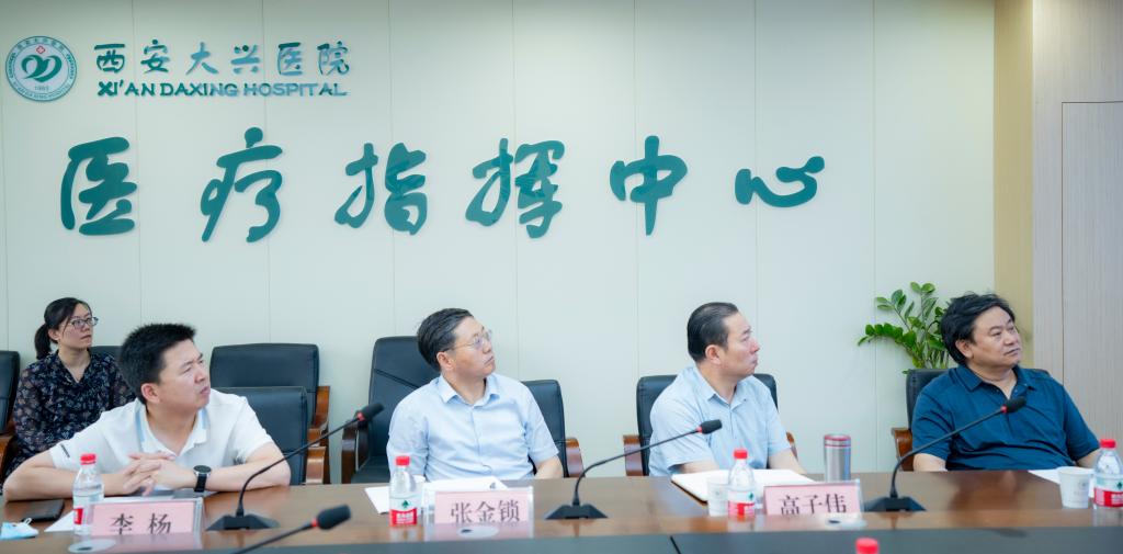 8月21日上午,我校党委书记张金锁,校长高子伟,党政办主任李杨,医学院院长韩继明一行4人赴西安大兴医院调研指导工作,并在医院5G急救指挥中心大厅举行座谈会。西安大兴医院党委书记、院长贺建军,董事长李振斌,副院长张贵和、李振贤,党委副书记梁红娟及相关科室人员参会交流。