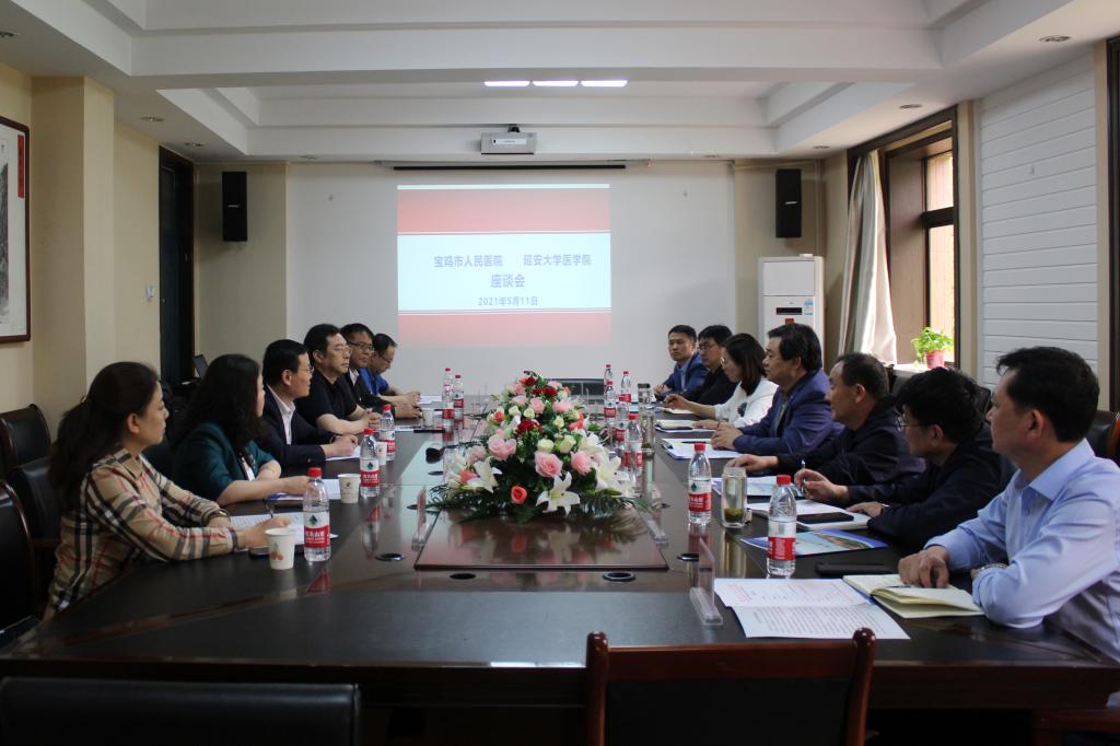 会前,宝鸡市人民医院与医学院在我校杨家岭校区逸夫楼楼304会议室召开了交流座谈会,医学院领导班子、综合办、教学办、学科与研究生教育办等参加了会议。座谈会由医学院党委常务副书记葛彬主持。医学院院长韩继明代表学院对李凌书记一行来校交流考察表示欢迎和感谢。他从历史沿革、发展定位、学科专业、基础条件、师资队伍、人才培养、社会服务、科学研究和发展愿景等方面介绍了学校及学院的发展情况,并提出三点希望,一是进一步加强学生学习过程管理;二是加深合作深度,提升合作成效;三是创新合作模式,实现共同发展。宝鸡市人民医院党委书记李凌从不断完善教学资源,逐步优化教学配置;加强教学管理,提高教学质量;加强专业理论授课,落实临床实习教学等三个方面汇报了医院的教学工作。并表示宝鸡人民医院与我校合作关系源远流长,从最初的实习医院到属附属医院再到第五临床医学院,通过近20多年的合作共建结下了深厚的友谊,两个单位的合作内容更加广泛,合作形式更加多元,合作层次不断提升,实现了发展共赢。座谈会期间,与会人员分别就课程建设、实践教学、研究生培养基地建设、科研立项等方面进行了深入地交流与探讨。