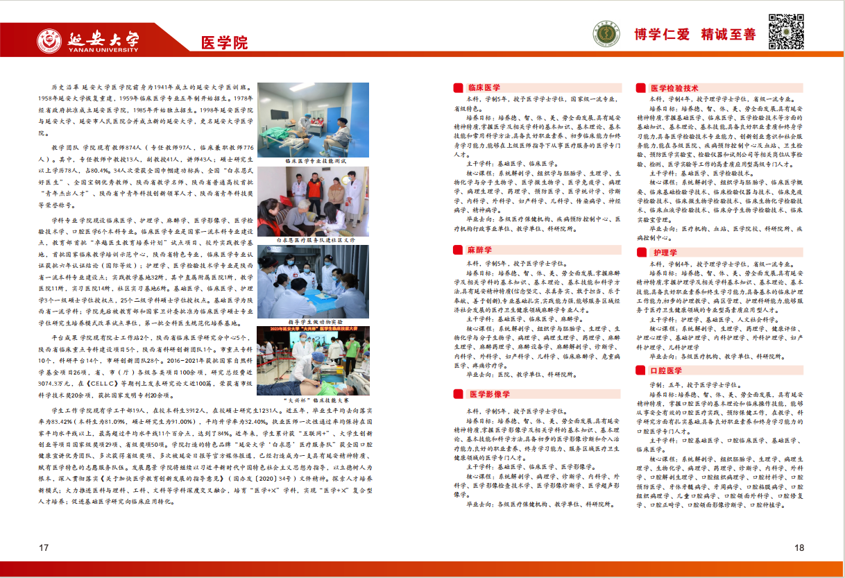 培养目标:培养具有社会主义核心价值观,具有延安精神特质,掌握基础医学、临床医学、麻醉学专业知识,能在医学社会活动方面,从事科学研究、医疗救助、健康教育等社会发展的医学专门人才。