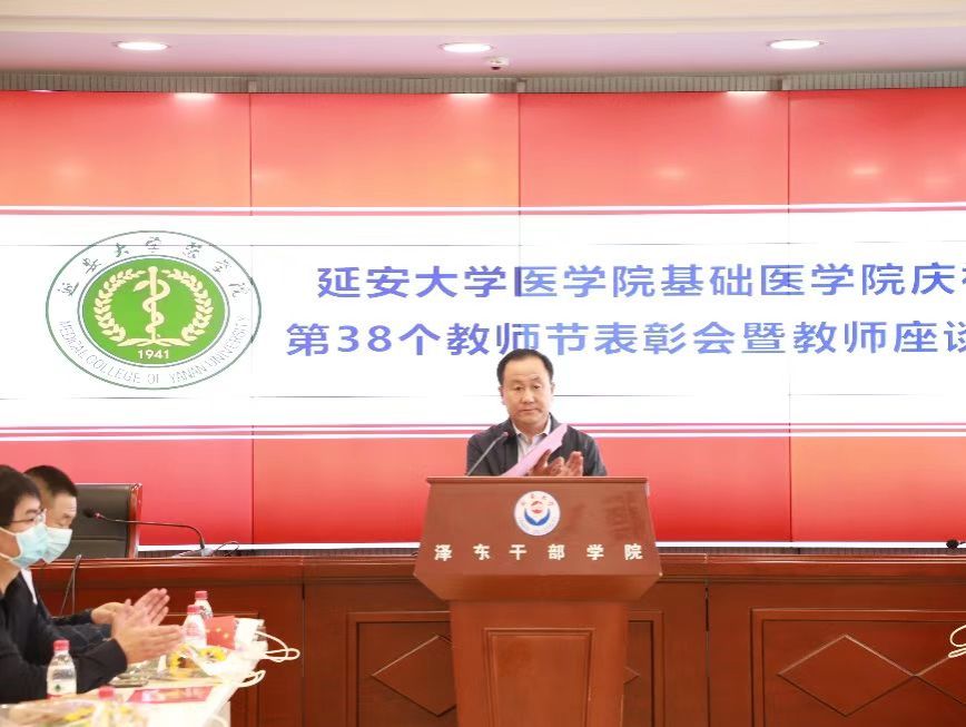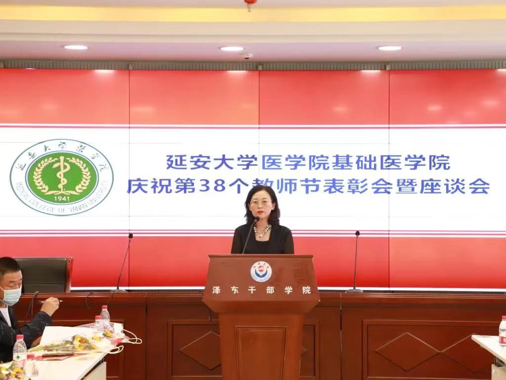 最后,基础医学院院长杨彦玲总结发言。首先代表基础医学院领导班子,向长期奋战在教学一线的教师和离退休教职员工致以诚挚的问候和崇高的敬意。随后,总结了一年来基础医学院在教学、科研、学科建设和人才培养等方面取得的成绩;最后给全院教师寄语,一是希望全院教师落实立德树人根本任务,努力成为“四有”好老师;二是希望广大教师坚定理想信念、恪守高尚师德,探索教育教学的新理念、新方法,为培养更多堪当时代大任的医学青年人才贡献智慧和力量。 三是希望全院老师坚守学院基础研究优势阵地,对标省一流学科建设、博士点申报培育等要求,夯实力、补短板、强特色,要锚定重点目标任务,扎实推进学院各项事业高质量发展,以更加优异的成绩庆祝建校85周年和迎接党的二十大胜利召开。