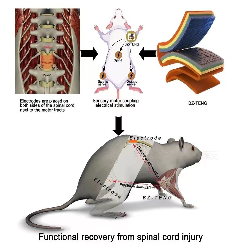 该研究设计了一种新型仿生z形结构纳米摩擦发电机(BZ-TENG),在大鼠肘关节后部植入后,可将关节屈伸动能转化为电能。BZ-TENG通过感觉-运动耦合电刺激产生电流,提供给坐骨神经和外侧脊髓,能显著促进脊髓损伤大鼠运动和感觉功能的恢复。这一成果为脊髓损伤的治疗提供了新方向和新思路。