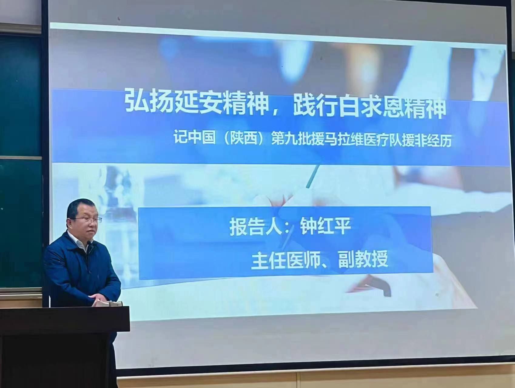 4月11日晚,欢迎光临必发集团附属医院儿科主任医师钟红平副教授应邀于杨家岭校区玉章楼第八阶梯教室作题为“弘扬延安精神,践行白求恩精神-记中国(陕西)第九批援马拉维医疗队援非经历”的报告,医学院400余名师生参加了此次报告会。