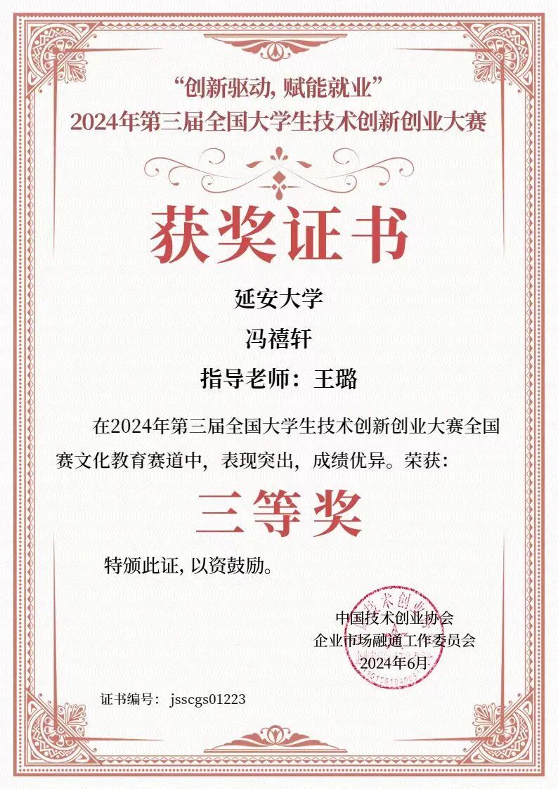祝贺我院学子冯禧轩团队在第三届全国大学生技术创新创业大赛获得三等奖