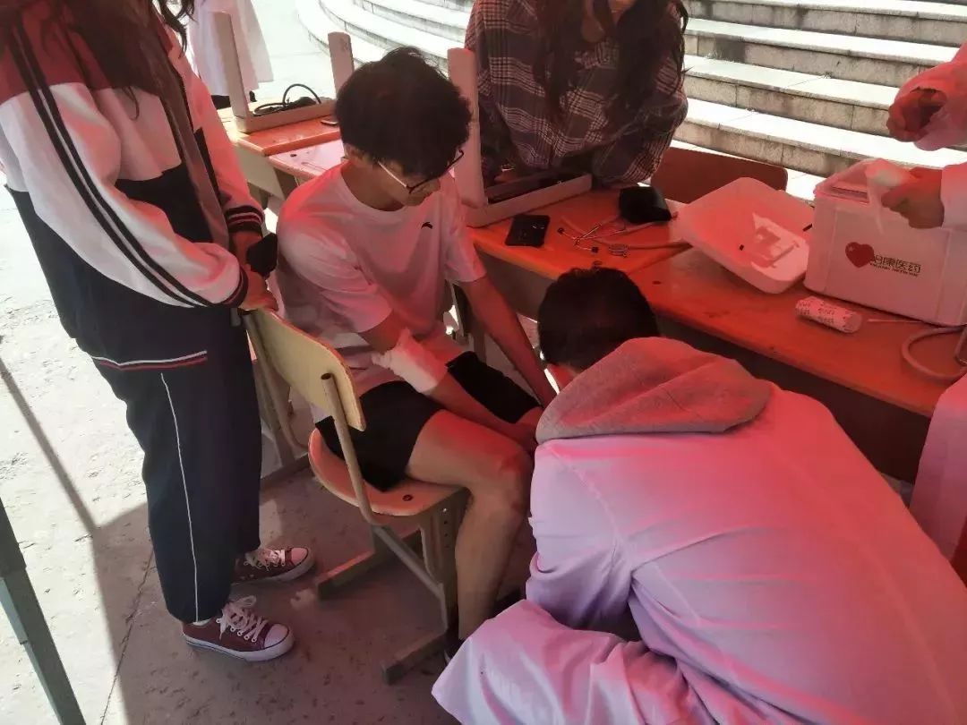 运动会开展期间,医学院“白求恩”医疗服务队时刻关注着运动场上的动态,用最专业的行动、最认真的态度,为运动员们保驾护航。在志愿服务过程中,队员们为身体不适的运动员测量血压,为劳累导致头晕乏力的运动员递葡萄糖水,为奋力拼搏而摔伤的运动员包扎处理伤口。