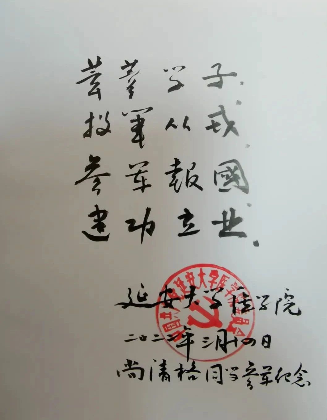 “莘莘学子,投笔从戎,参军报国,建功立业。”韩院长亲自为尚清格书写并赠送了书法作品,这简短而铿锵有力的赠言,表达了韩院长对入伍学生的殷切期望,希望更多有志青年大学生能向尚清格同学学习,积极响应国家号召,投身国防建设,贡献青春力量。
